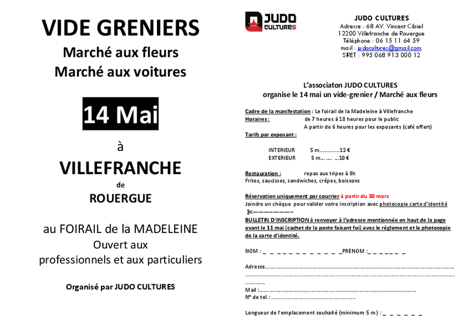 Vide-greniersLe 19/04/2026Villefranche-de-RouergueOrganisateurs : Association Libre Chats en Bastide.