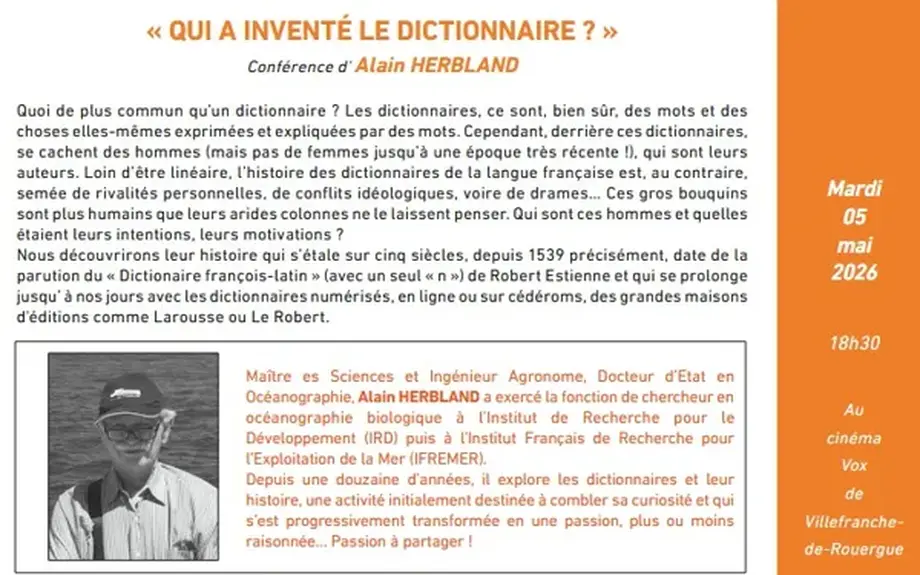 Maître es Sciences et Ingénieur Agronome, Docteur d’État en Océanographie, Alain HERBLAND a exercé la fonction de chercheur en océanographie biologique à l’Institut de Recherche pour le Développement (IRD) puis à l’Institut Français de Recherche pour l’Exploitation de la Mer (IFREMER). Depuis une douzaine d’années, il explore les dictionnaires et leur histoire, une activité initialement destinée à combler sa curiosité et qui s’est progressivement transformée en une passion, plus ou moins raisonnée… Passion à partager
