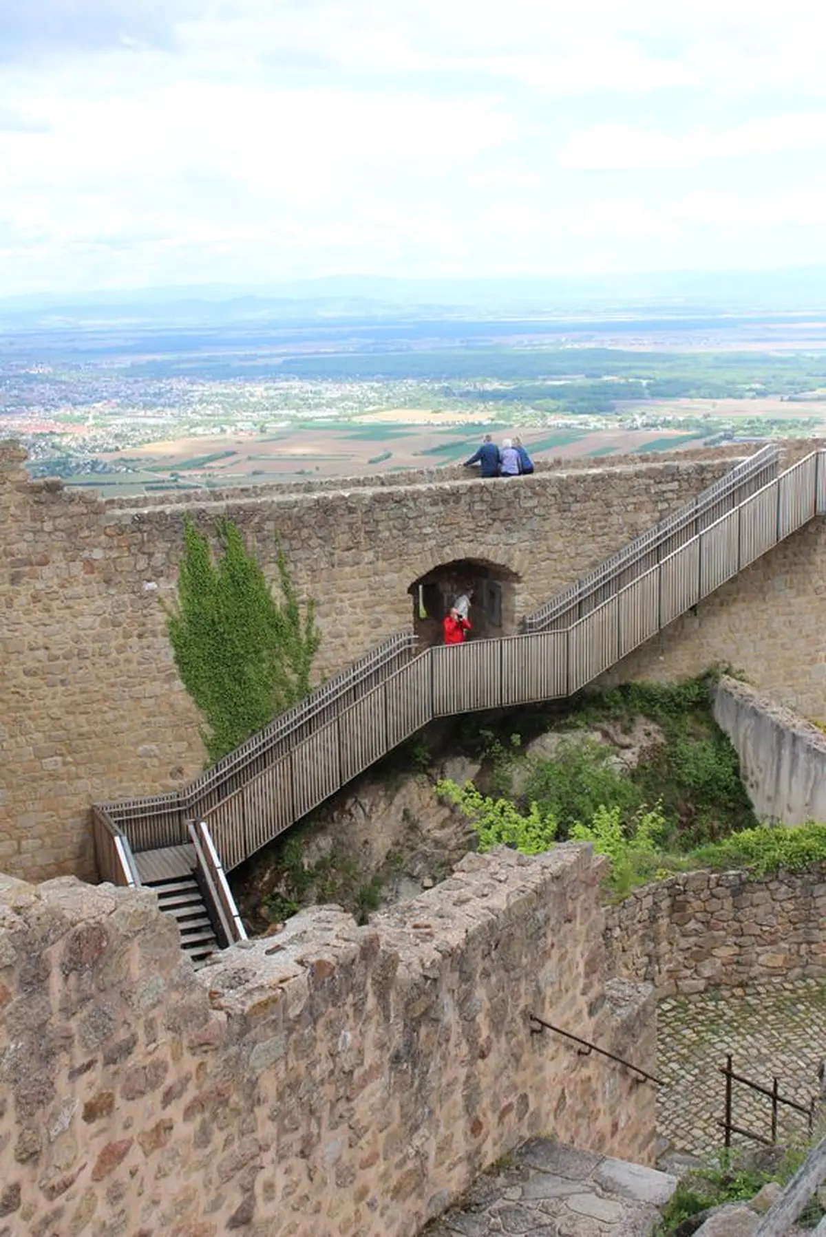 La montée sur les remparts est la partie la plus fantastique de la visite. Depuis son chemin de ronde, le château du Hohlandsbourg offre un splendide panorama à 360°. Les murailles massives, de 100 mètres sur 60, enserrent une grande cour dominée au nord par le château supérieur. Positionné de façon idéale, l’ensemble surplombe la ville de Colmar et les pittoresques cités viticoles. Sur le chemin de ronde, le regard du visiteur embrasse toute la plaine d’Alsace et les Vosges.