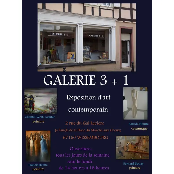 Quatre artistes, à savoir Chantal Wolf-Laeufer (peinture), Astride Heintz (sculpture céramique), Bernard Douay (peinture) et Francis Heintz (peinture), vous invitent à venir découvrir leurs œuvres dans un cadre agréable et baigné de lumière.
